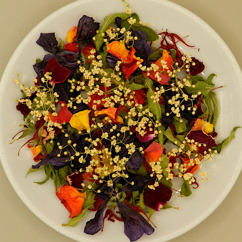 Zutaten: Rosenblüten, Verveine, Holunderblüten, Malvenblüten, wilder Majoran, Goldmelissenblüten (aus Wildernte/Anbau)