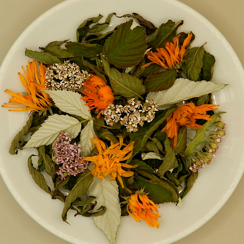 Zutaten: Pfefferminze, Himbeerblätter, Schafgarbenblüten, Ringelblume (aus Wildernte/Anbau)