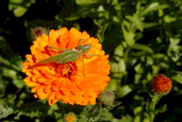 spätsommerlicher Besucher auf der Ringelblume: Heupferd