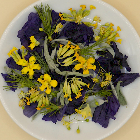 Zutaten: Salbei, Lindenblüten, Malvenblüten, Lärchenspitzen, Frühlingsprimel, Königskerze (aus Wildernte/Anbau)