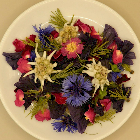 Zutaten: Malven-, Rosen-, Edelweissblüten, Lärchenspitzen und Kornblumen (aus Wildernte/Anbau)