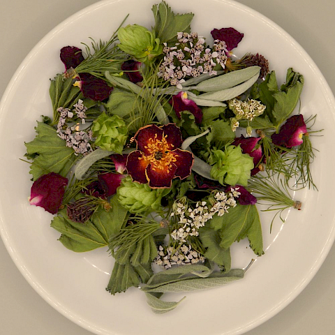 Zutaten: Frauenmantel, Salbeiblätter, Rosenblüten, Schafgarbenblüten, Lärchenspitzen, Hopfenblüten, Lärchenblüten (aus Wildernte/Anbau)