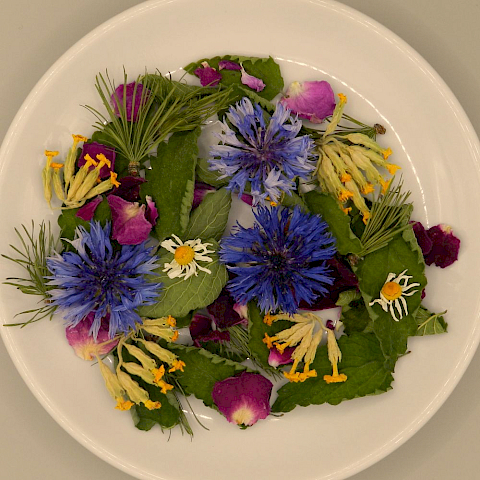 Zutaten: Zitronenmelisse, Rosenblüten, Kornblumen, Schlüsselblumen, Kamillenblüten, Lärchenspitzen (aus Wildernte/Anbau)