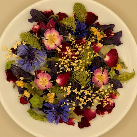 Zutaten: Holunderblüten, Weisse Melisse, Lindenblüten, Malve, Kornblumen, Tannenspitzen, Rosenblüten (aus Wildernte/Anbau)